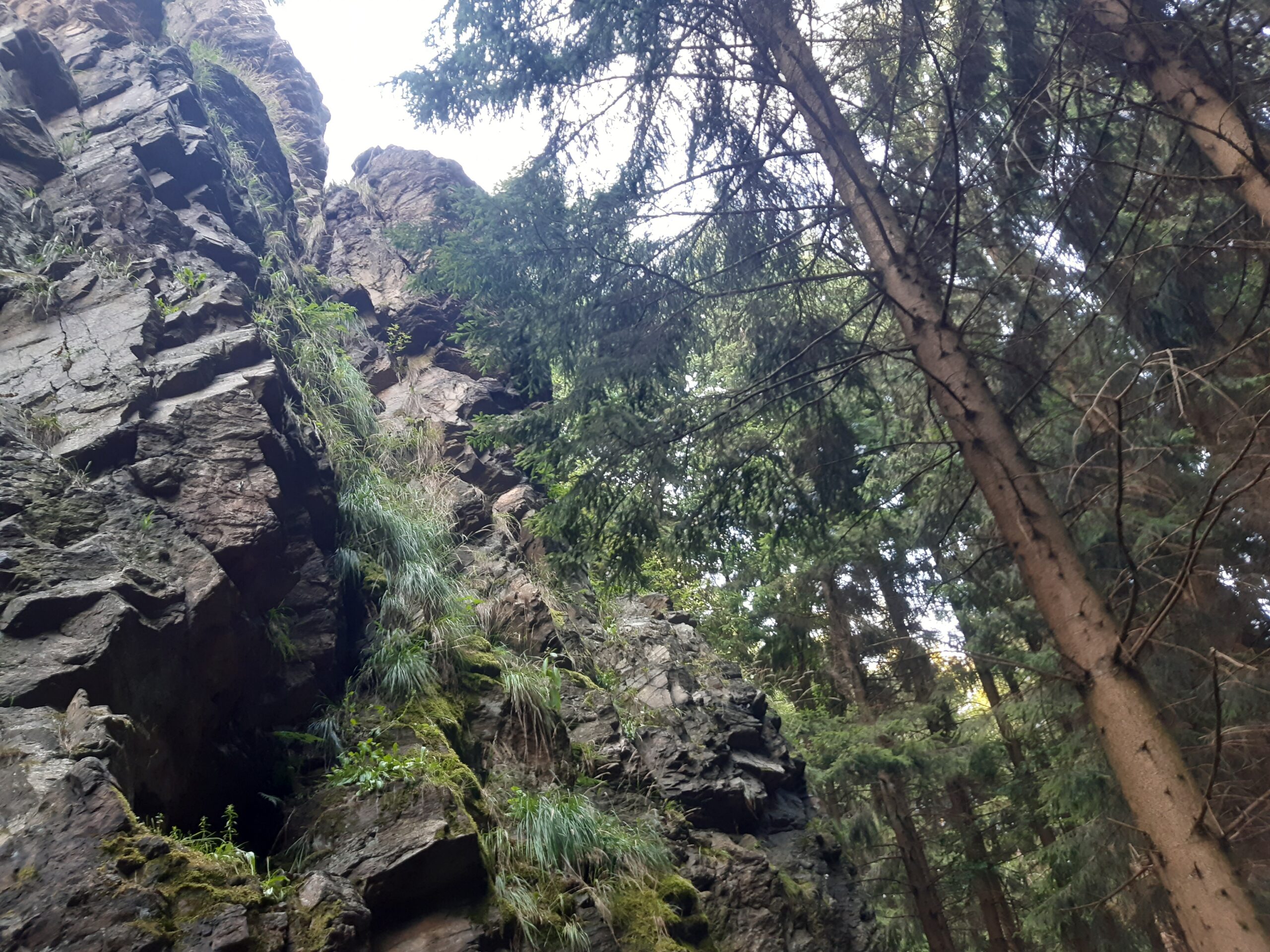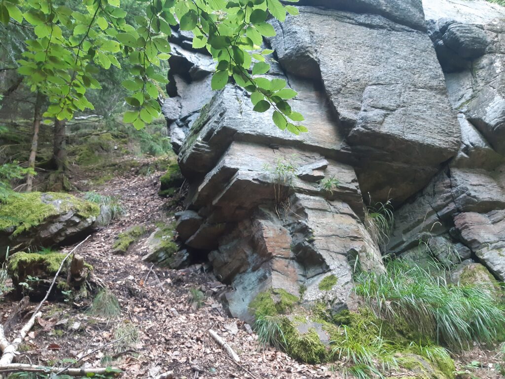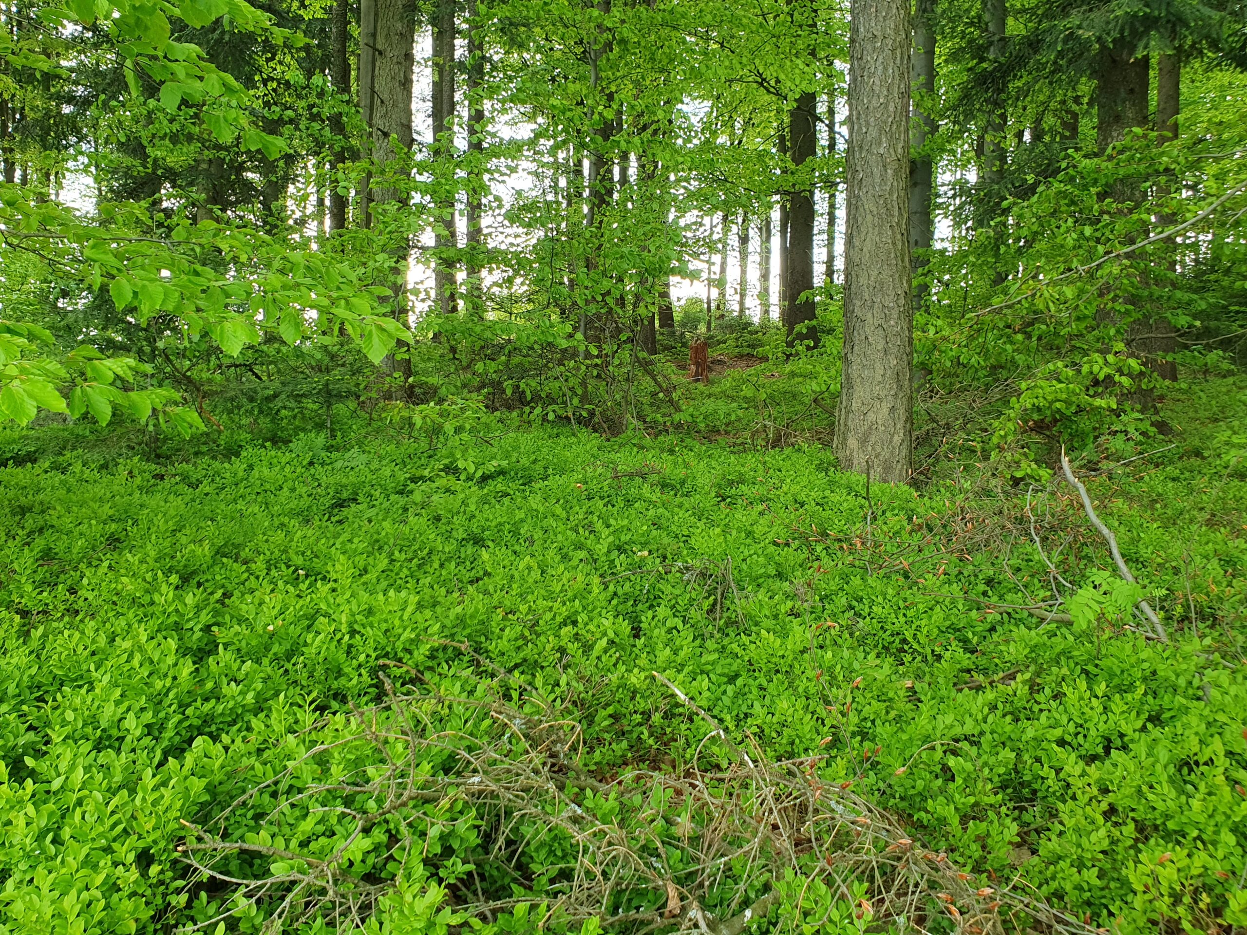 podhorský les, 560 – 720 m n. m., část svažitá, v SV části skály, středně hustá síť komunikací